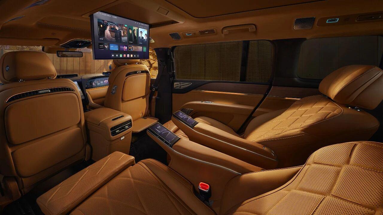 刘胜表示,这款车不仅瞄准了高端商务接待,走行政路线,也照顾到了多人家庭的出行。为了让旅途不再无聊,仰望U8L在娱乐系统上也下足了功夫。车内配备21.4英寸的电动折叠吸顶屏,搭配32个高级音响系统,立体声从四面八方传来,影音效果像是置身于电影院中。再加上天然纯羊毛脚垫,触感柔软,豪华感就从这些细节处逐一释放出来。